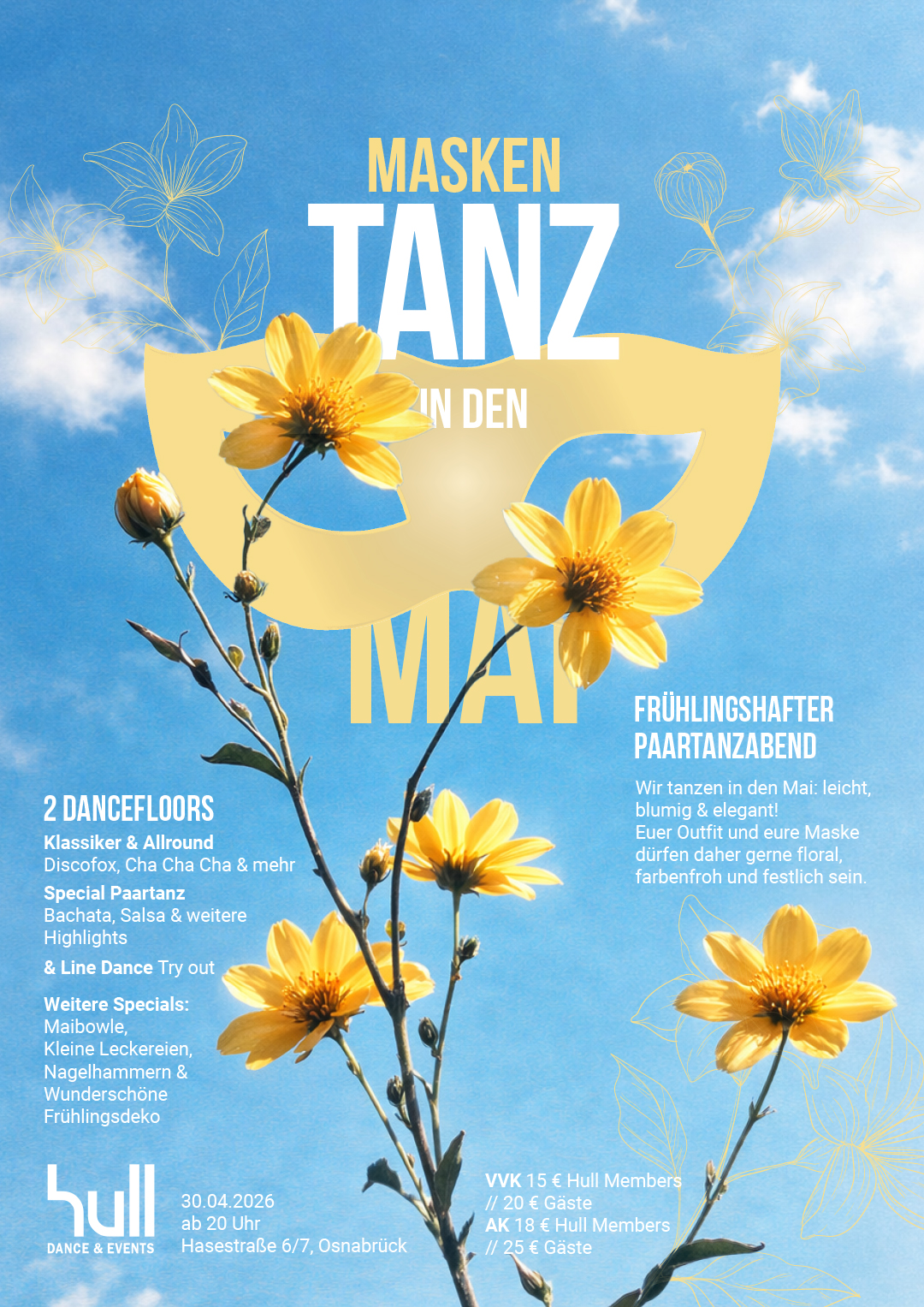 Wir feiern den Frühling mit einem besonderen Paartanzabend! Beim Masken-Tanz in den Mai erwarten euch blumige Eleganz, festliche Stimmung und zwei Dancefloors.