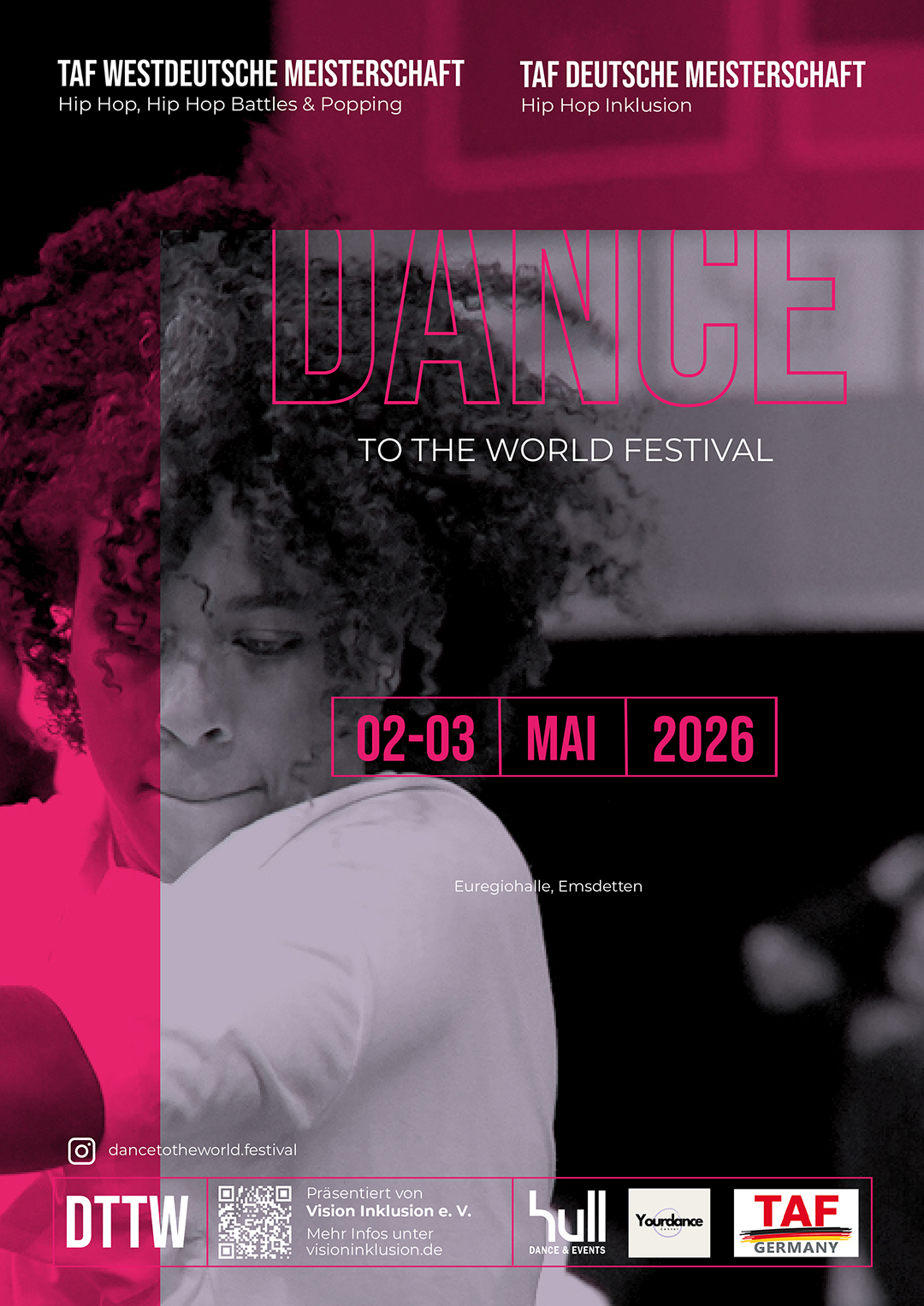 Im Rahmen des Dance to the World Festivals finden die TAF Westdeutsche Meisterschaft Hip Hop, Hip Hop Battles & Popping sowie die TAF Deutsche Meisterschaft Hip Hop Inklusion statt.